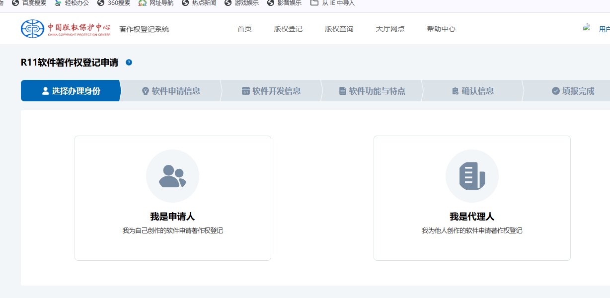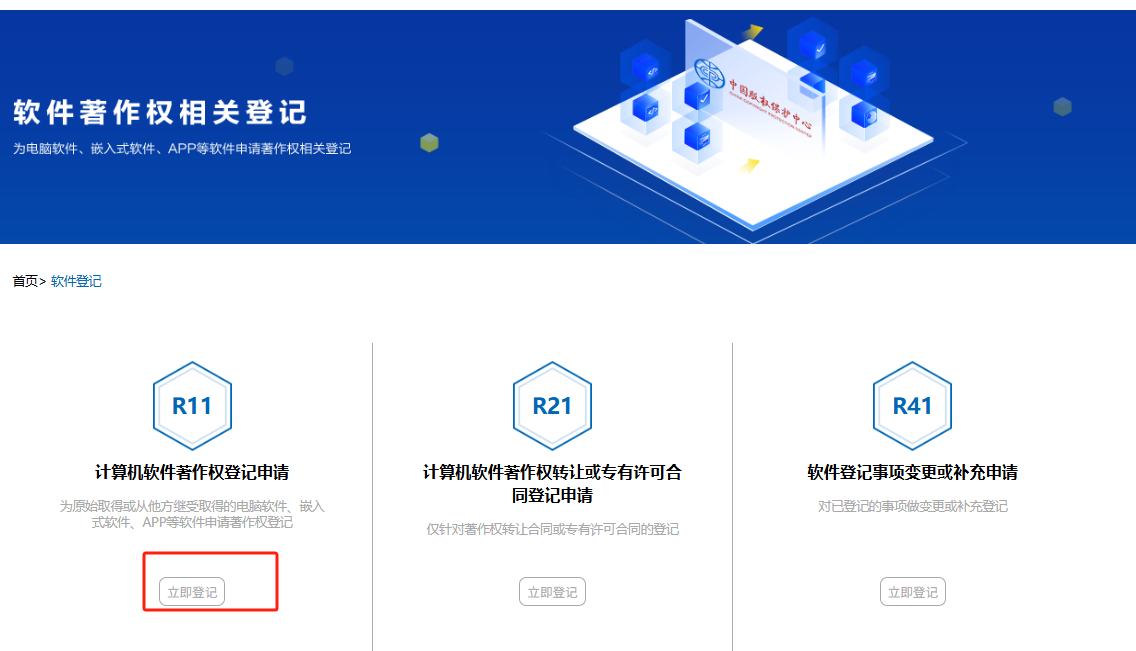 然后找到软件著作权登记选项并点击进入, 接着找到 “R11 计算机软件著作权登记申请界面,选择 立即登记