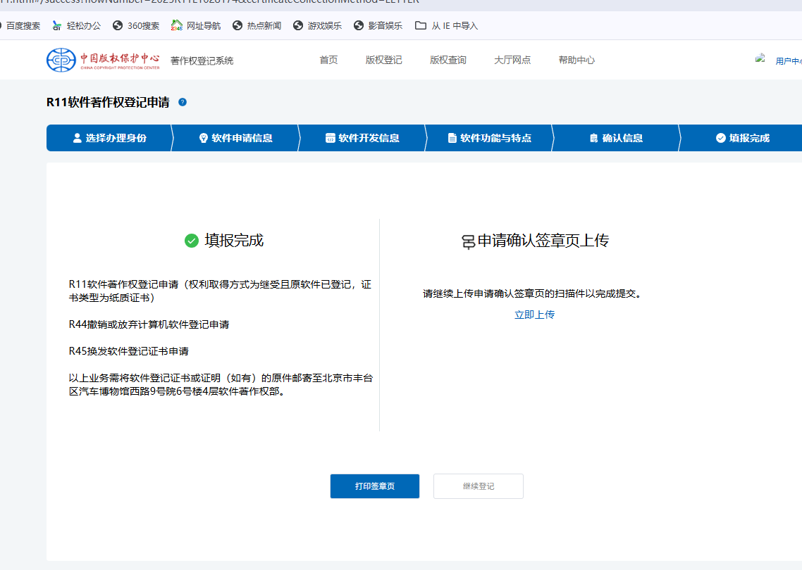 7. 上传签章页:提交成功后,需要打印签章页。