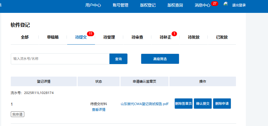 随后点击用户中心,找到 软件登记界面,找到刚才提交的软件著作权申请,点击 上传签章页,将保存好的 PDF 文档上传,