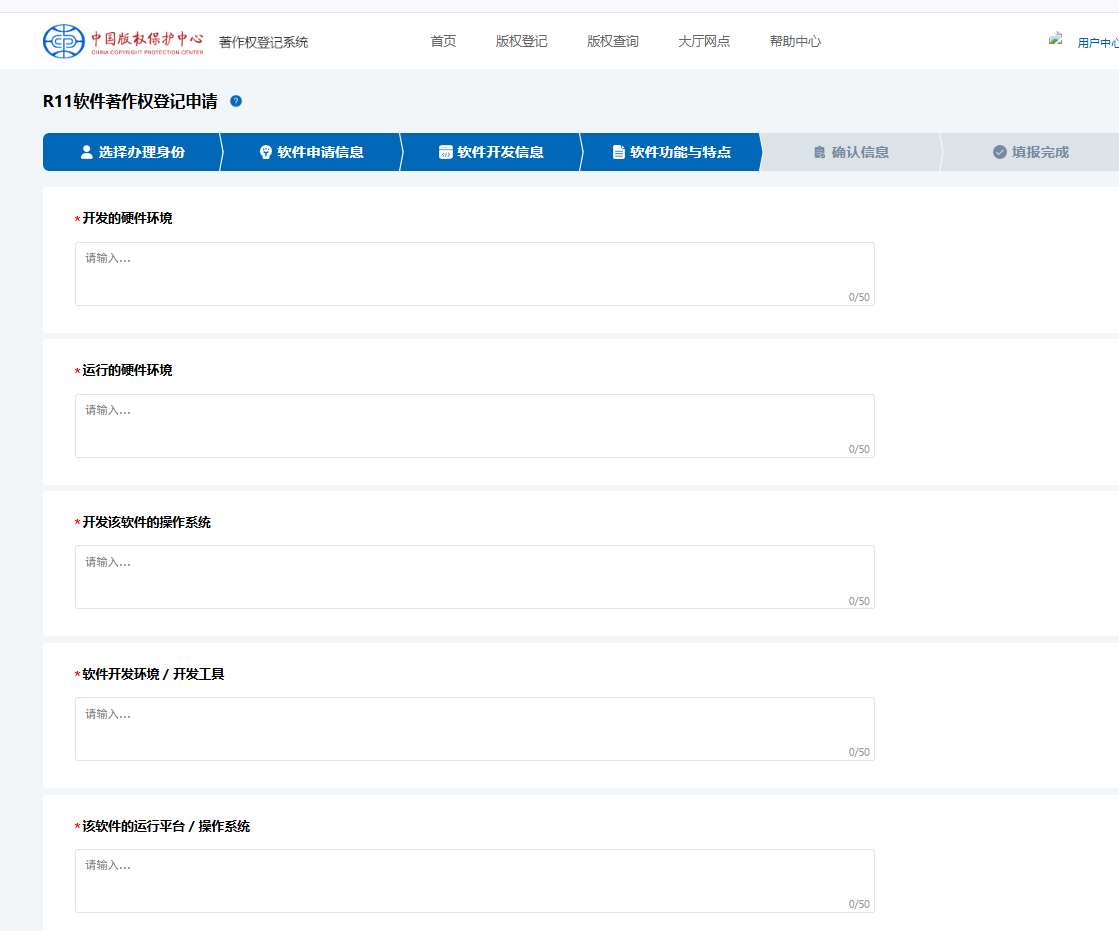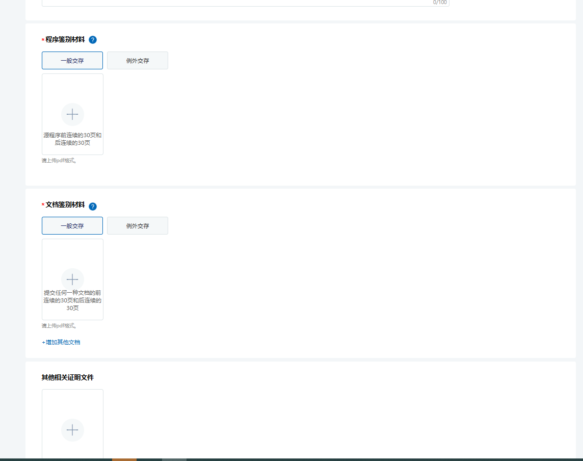 在此界面,需要填写开发环境以及功能用途信息。直接复制生成材料中的采集卡就可以,若有疑问可以随时私信我最后上传程序鉴别材料也就是60页源代码PDF,文档鉴别材料就是PDF版的用户手册,如有其他证明文件, 比如商标证书,软件测试报告可以上传至其他证明文件,点击下一步。