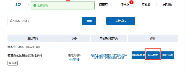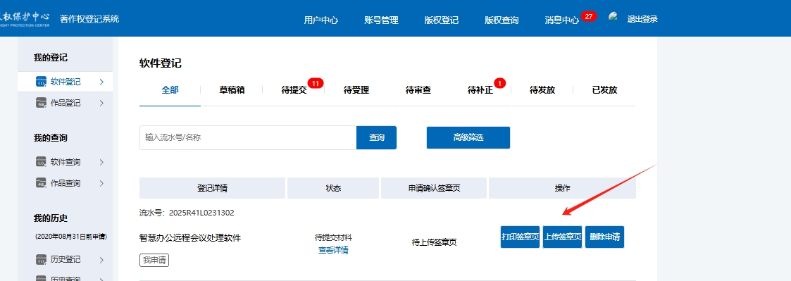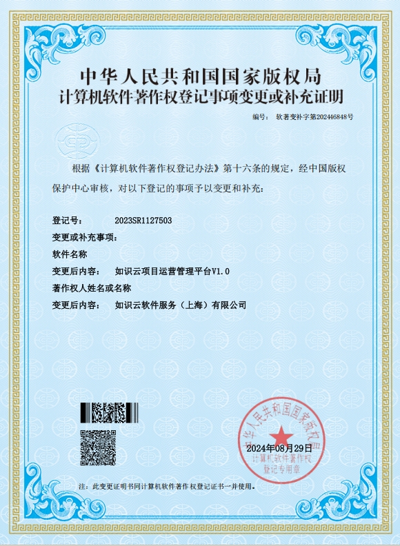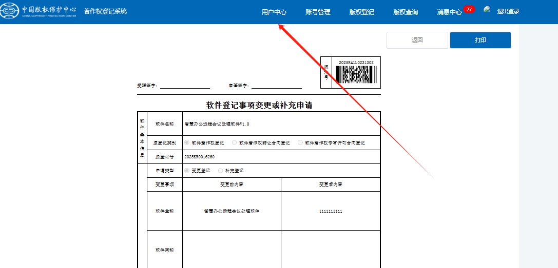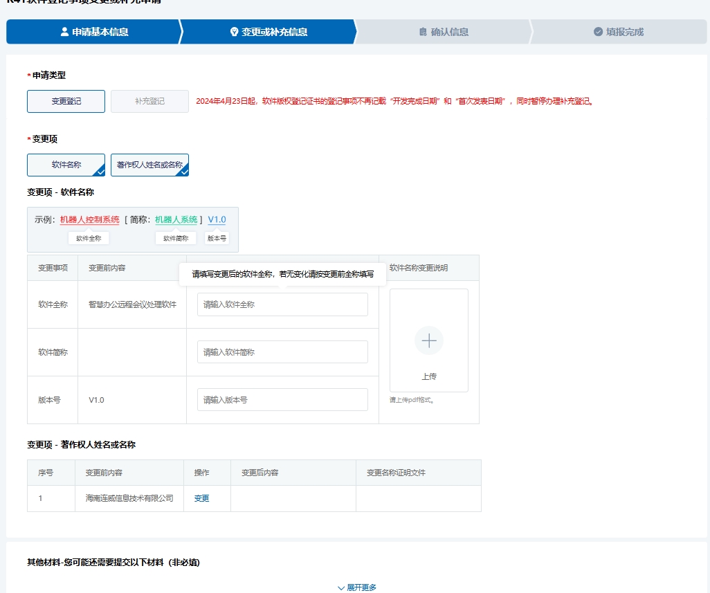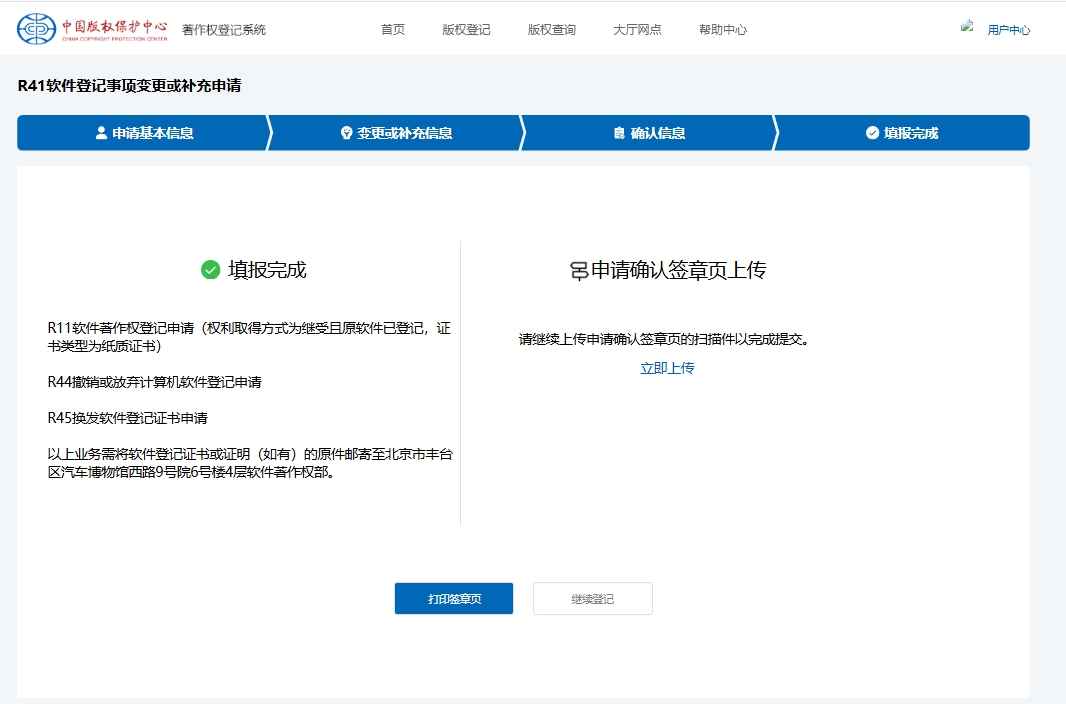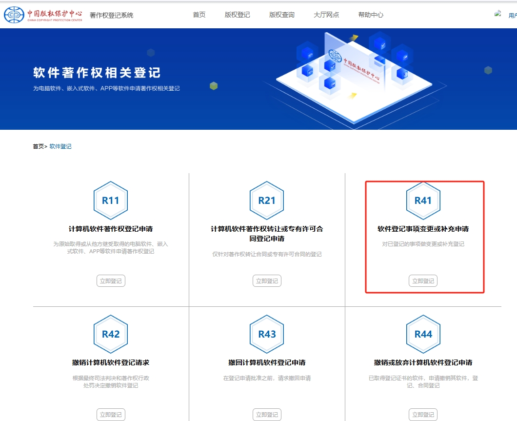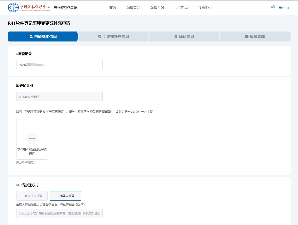 第二步:登录成功之后点击计算机软件著作权相关登记申请(3)随后点击R41软件登记事项变更申请(4)进入填写申请信息界面(5)输入需要变更证书上的登记号(6)以及办理方式,为自己办理选择由著作权人,为他人办理选择由代理人(7),随后需上传原证书扫描件,变更证明以及对应证明文件(8),需要注意的是,目前变更登记只支持修改软件全称,简称,版本号以及著作权人信息(9),修改这些信息时需提供相应的证明材料,比如企业名称发生变更,对应的著作权人以及软件名称开头的品牌名也需要进行变更,则需提供工商变更证明(10),随后将软件著作权证书,变更证明以及对应的证明文件合并一个PDF文件进行上传,上传完点击下一步,输入变更后内容同时上传变更证明文件(11),再次点击下一步,最后确认完填写信息后点击保存并提交申请(12),点击打印签章页在第二页右下角申请人签章处并加盖企业公章(13),随后返回用户中心(14),点击上传签章页(15)上传加盖公章后扫描PDF的签章页(16),最后点击确认提交按钮即可进行受理阶段(17),变更的审核流程分为受理,审查,下证(18),总共周期大约在20个工作日左右,下证后会发放一个变更证明(19),配合原证书一起使用。